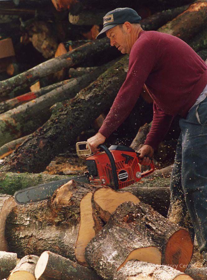 A color photograph of an unknown man cutting wood with a chain saw in Topsham, Maine, was taken on 5/6/1987.