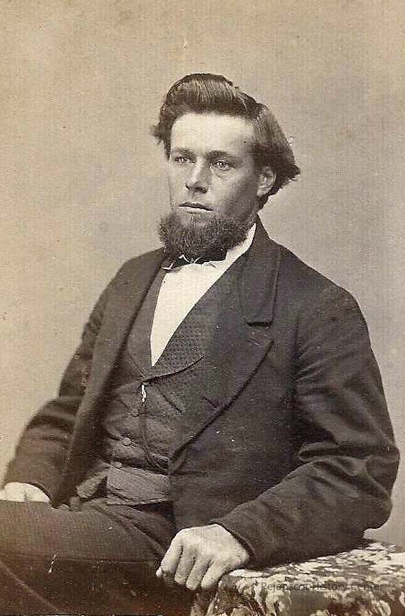 A B/W photograph of a unknown seated man. There is a 2 cent stamp on the back. Undated