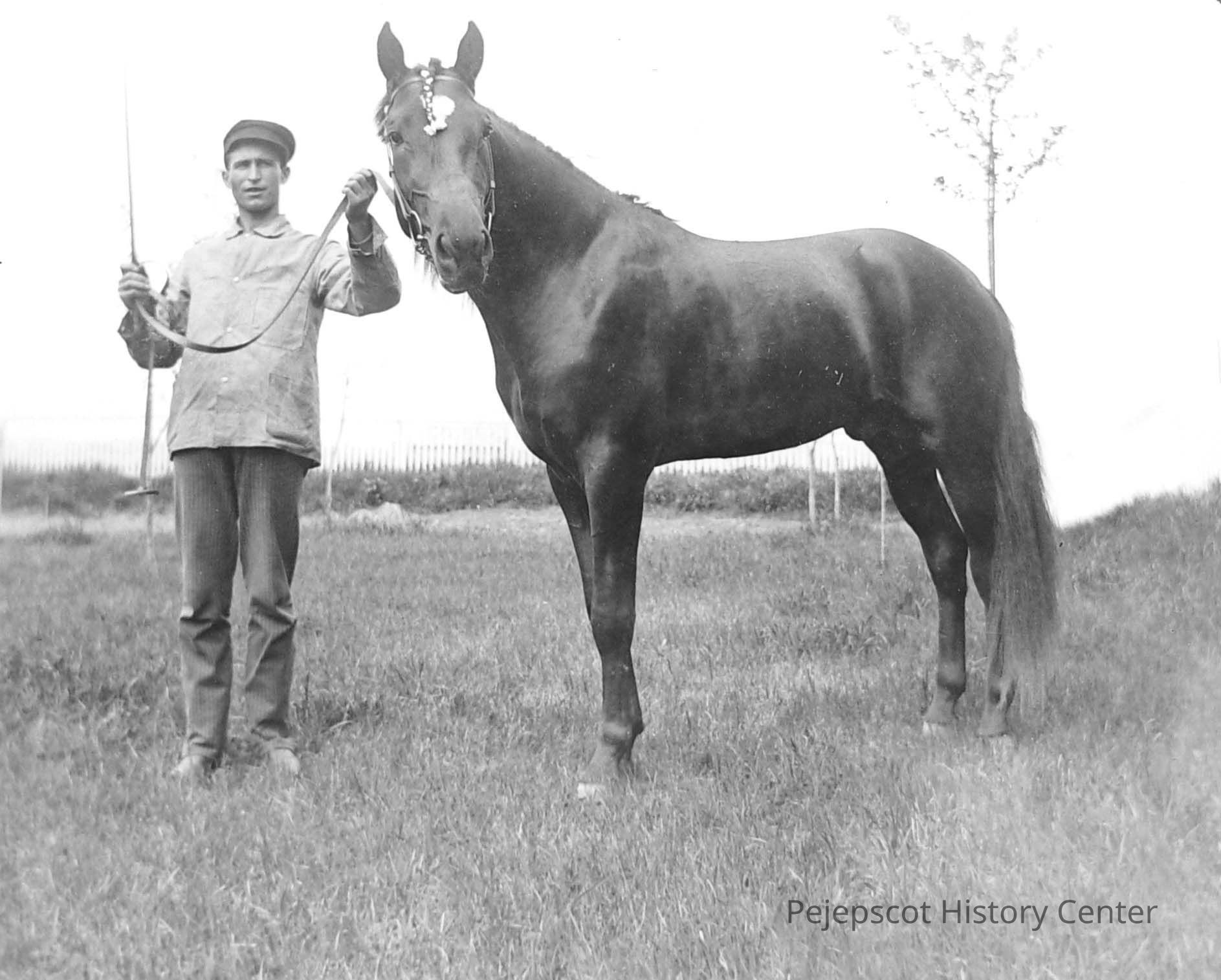 A glass negative with a photograph of an unknown man and horse in a meadow.