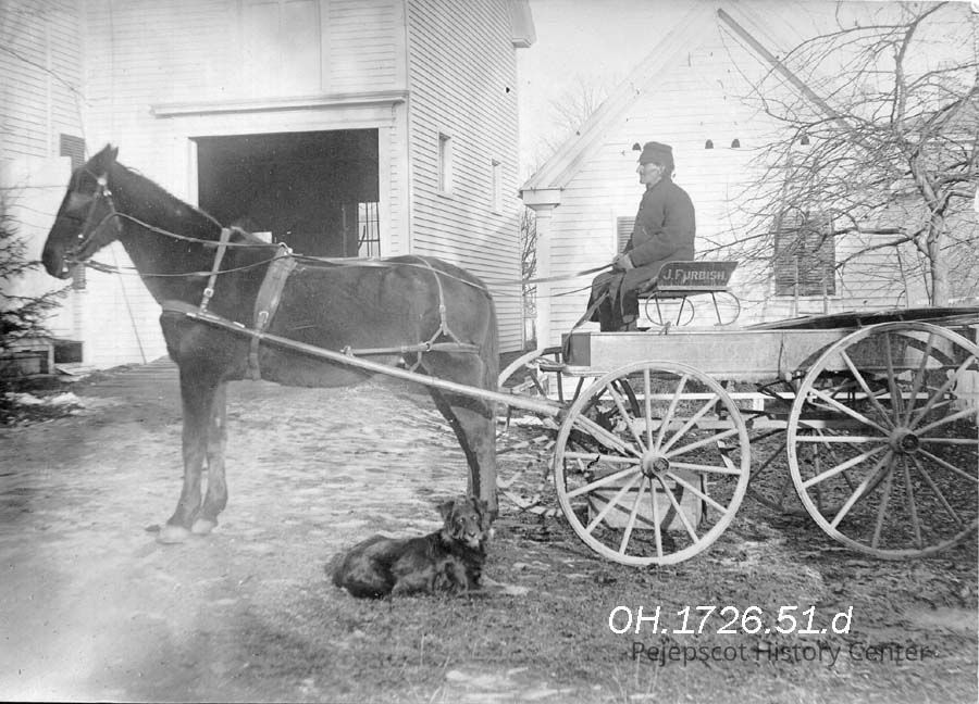 A B/W photograph of an unknown man driving a wagon. Maybe a Furbish. There is "J. Furbish" printed on the side of the seat. Photo not dated.