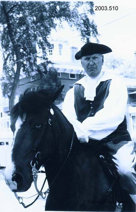 An undated black and white photograph of man in colonial attire sitting on a horse may have been taken as part of the U.S. bicentennial in 1976.