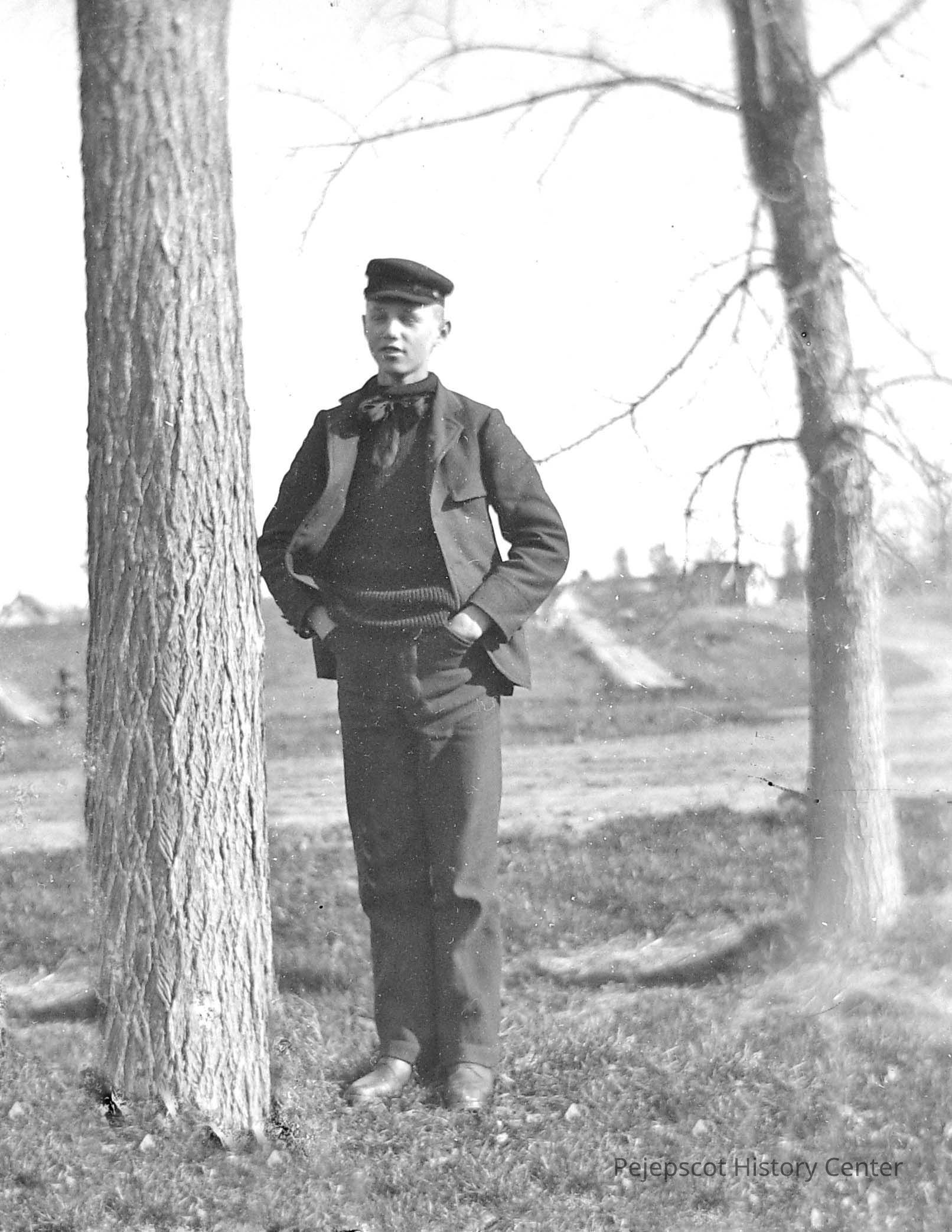 A glass plate negative with a photograph of an unknown man standing outside. "CD-R "Glass Negatives #2 #29" Undated.