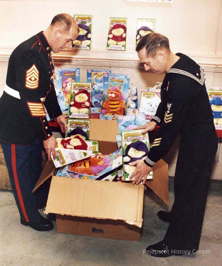 A color photo of two unidentified men in uniform looking at a box of toys, probably for the Marine Reserve Toys for Tots program in Topsham, Maine, is dated 11/25/1986.