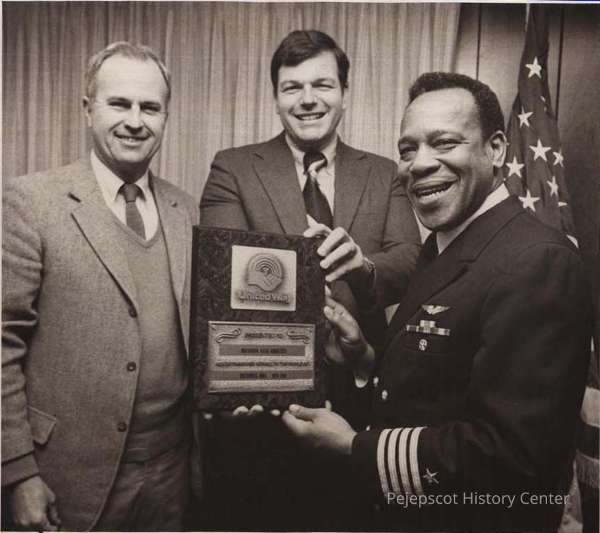 A black and white photo of Navy Capt. Benjamin T. Hacker Sr. and two unidentified men. Hacker, was commanding officer of Brunswick Naval Air Station from August 1978 to August 1980. The photo was published in The Times Record in Brunswick, Maine, on 1/17/1980.Collection