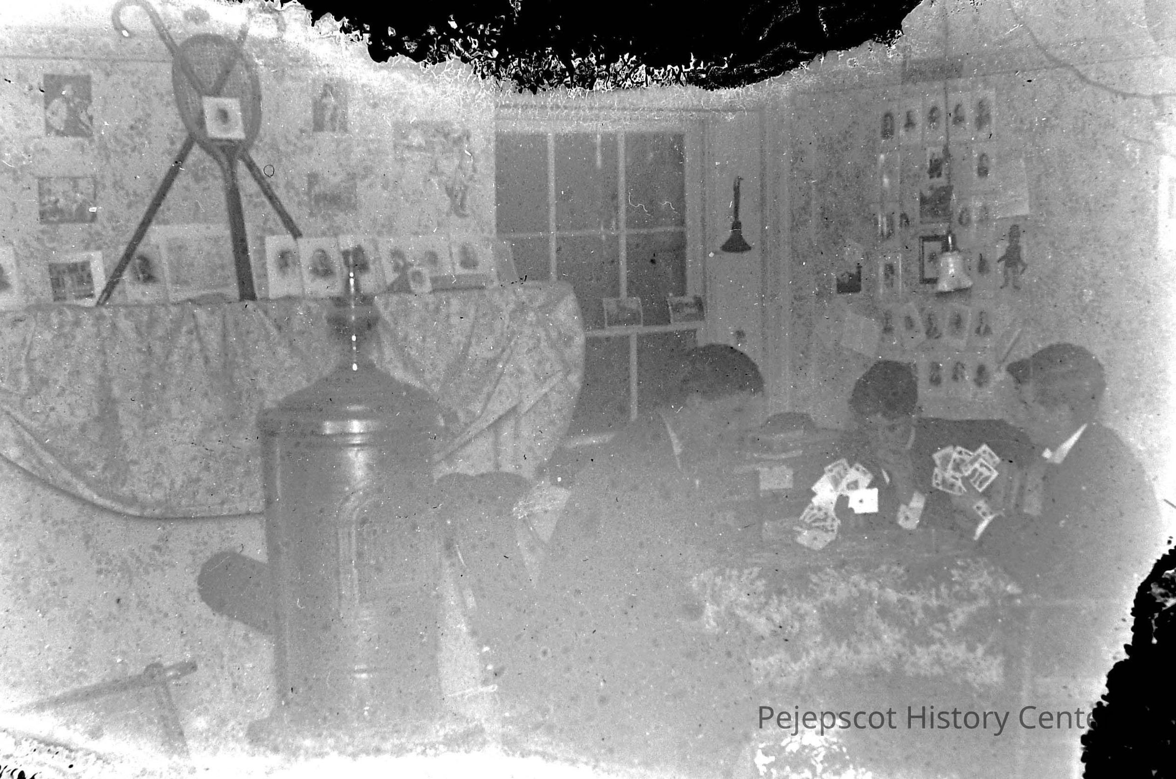 A glass plate negative with a photograph of a group of people sat at a table playing cards in a room. "CD-R "Glass Negatives #2" #More Glass #.003 Undated.