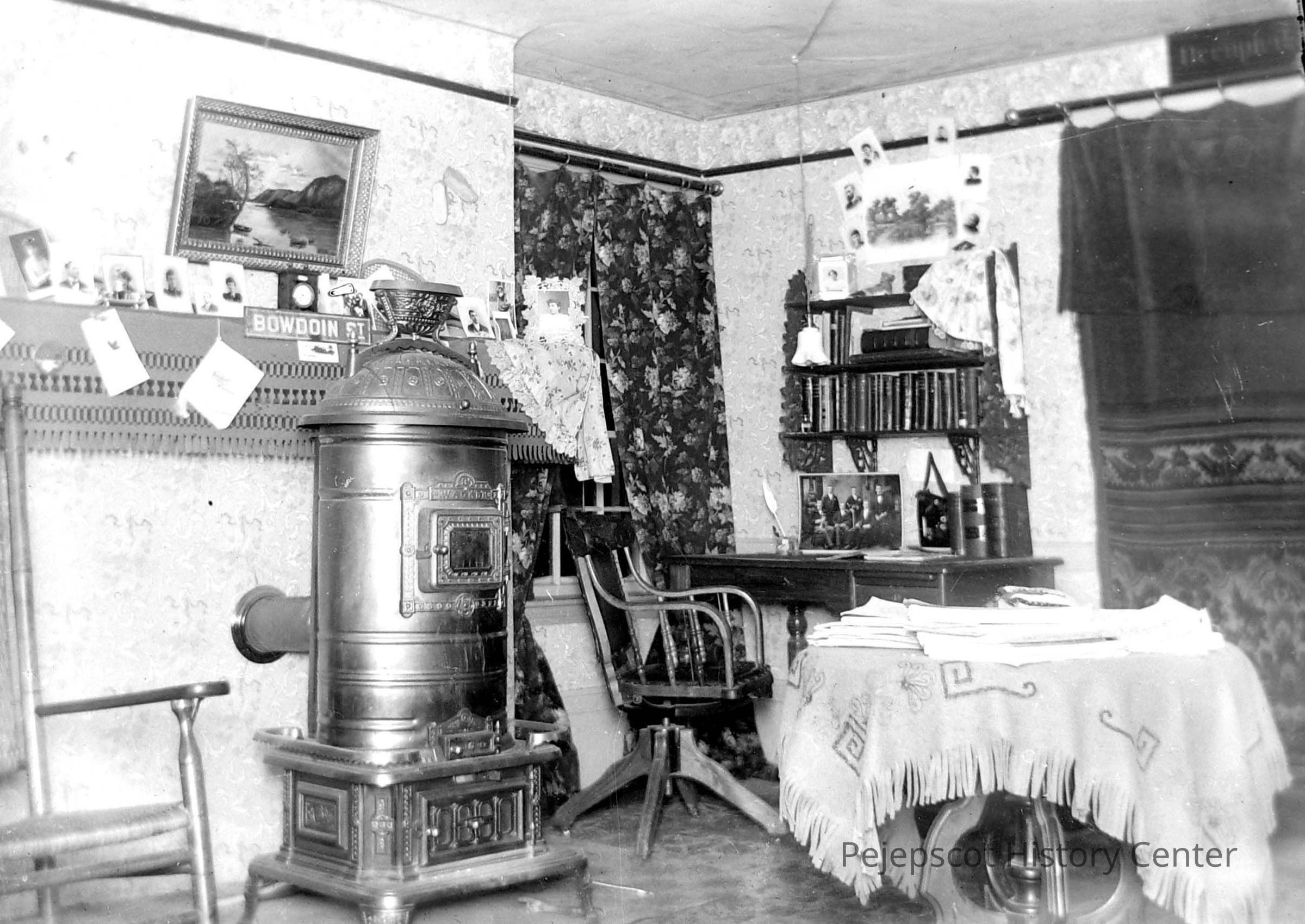 A glass plate negative with a photograph of a room with a large stove and a sign which says "Bowdoin St." "CD-R "Glass Negative #2" #65 Undated.