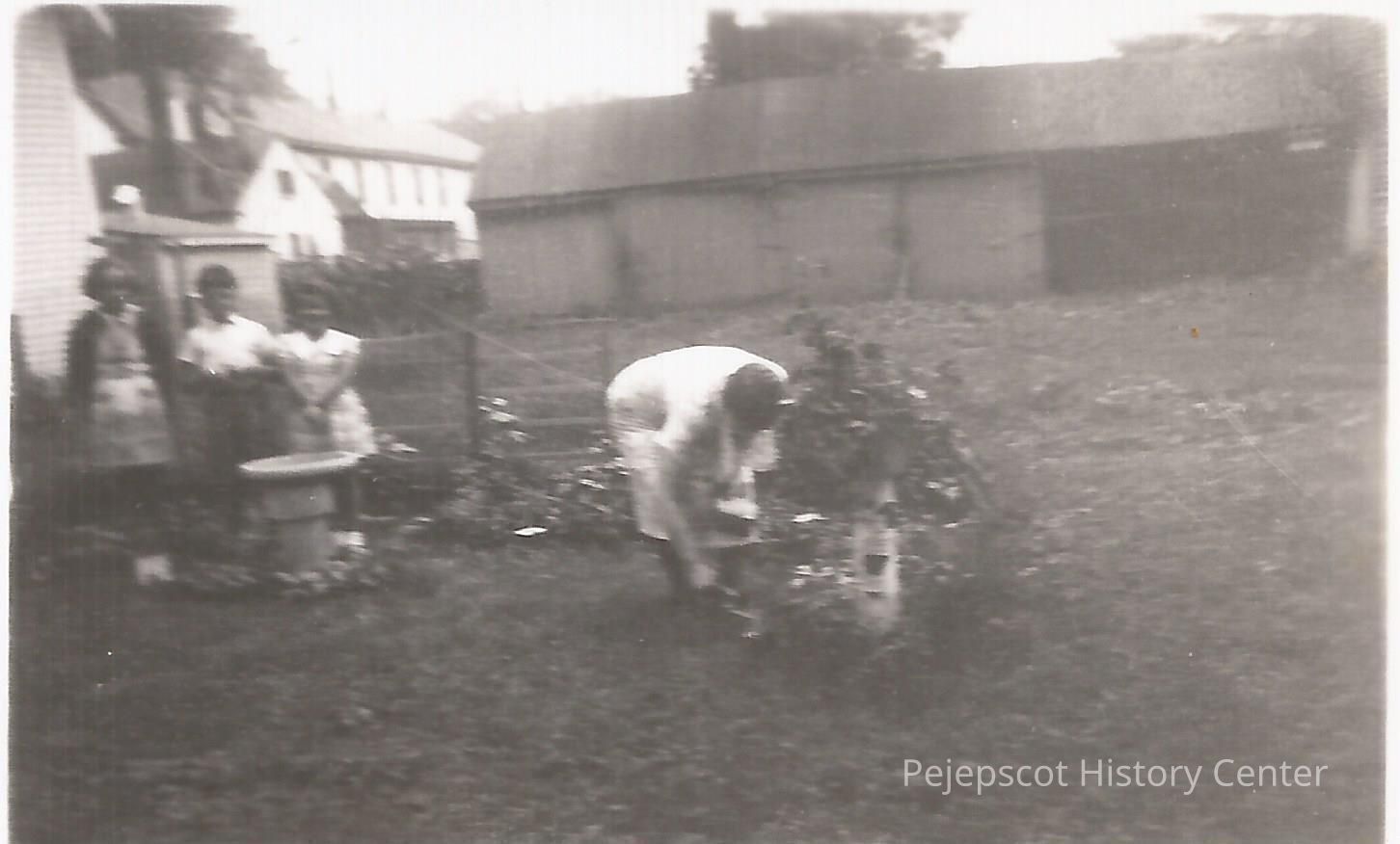 A color photograph of an unknown woman gardening with three children looking on. Undated