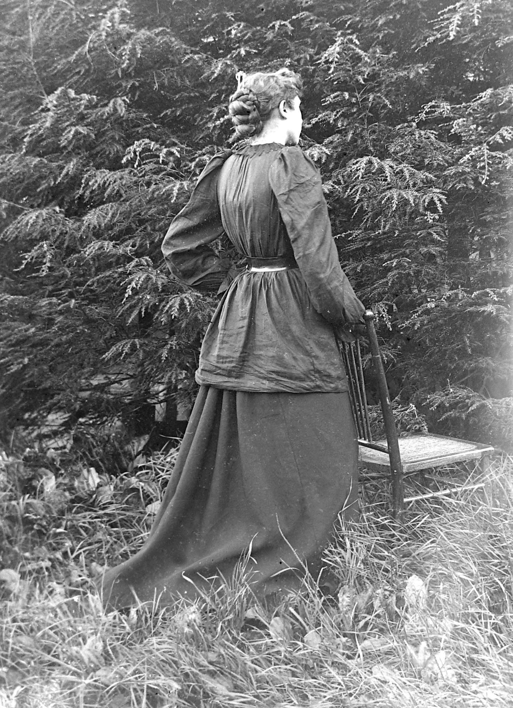 A glass plate negative with a photograph of an unknown woman facing away from the camera holding a chair. Copy of 2020.21.50. "CD-R "Glass Negative Photos" #49 Undated.