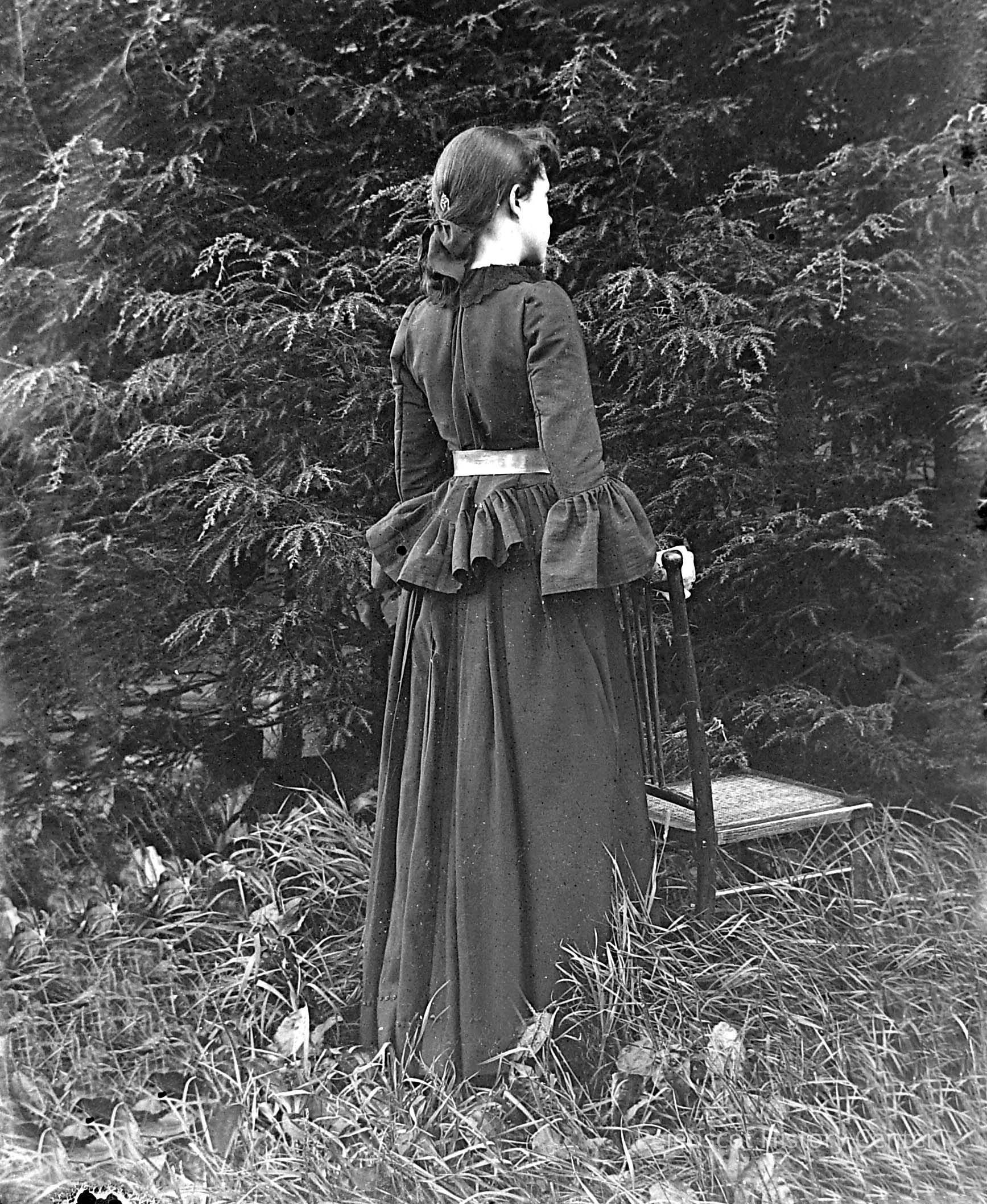 A glass plate negative with a photograph of an unknown woman standing outside with her back to the camera. She is holding onto a chair. "CD-R "Glass Negs #2" #58 Undated.