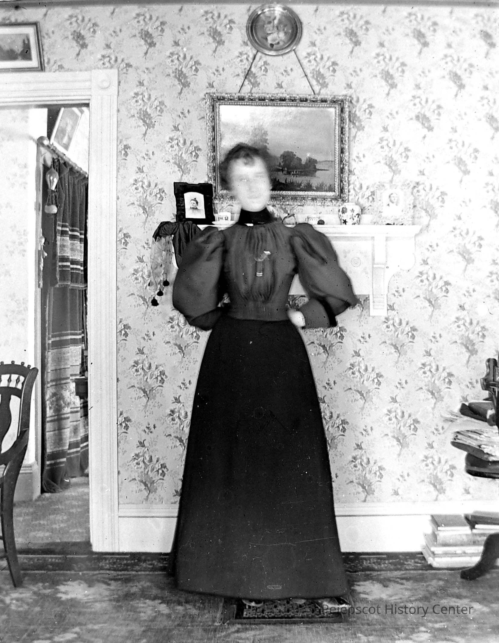 A glass plate negative with a photograph of an unknown woman standing in a room. "CD-R "Glass Negatives #2" #67 Undated.