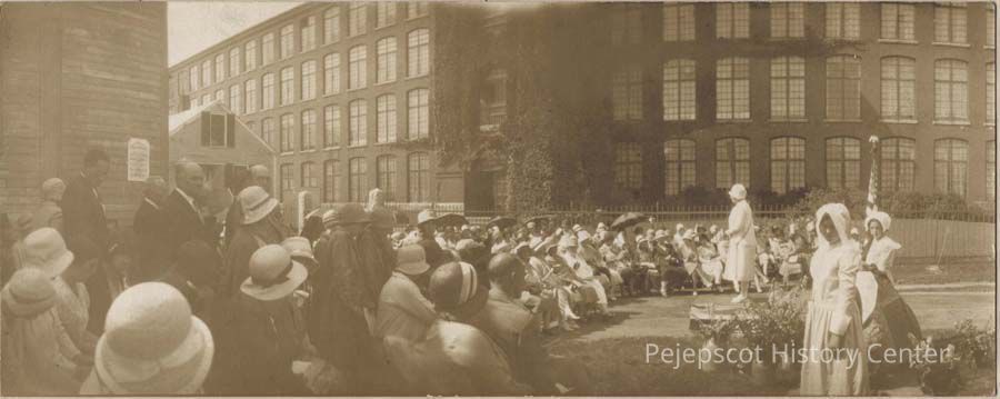 A B/W photograph of the unveiling of the stone at Fort Andross by the State Society, Daughters of the American Revolution. The photograph is glued to a piece of paper. On the back of the paper is a newspaper clipping about the unveiling. 07/12/1930