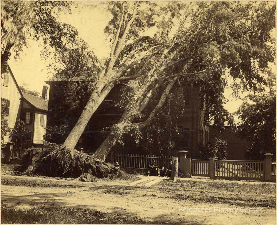 A sepia-toned photo of upended trees resting on a house on Federal Street, Brunswick after a windstorm dated June 14, 1892.