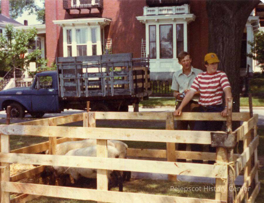A color photo of two men at a sheep petting pen. The Skolfield/Whittier House can be seen in the background. Brunswick, Maine.