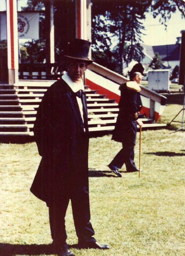 A color photograph of some people in period costumes for the US Bicentennial celebration. They are standing at the Gazebo, Brunswick, Maine. One man is dressed as Lincoln.