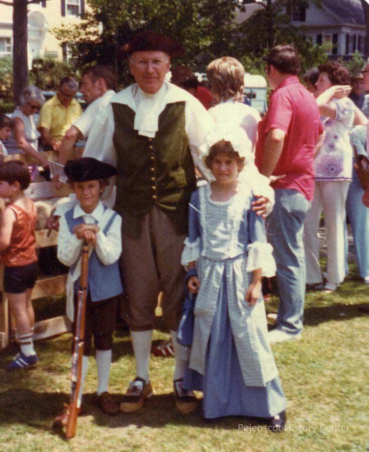 A color photograph of some people in period costumes for the US Bicentennial celebration, Brunswick, Maine. 7/4/1976.