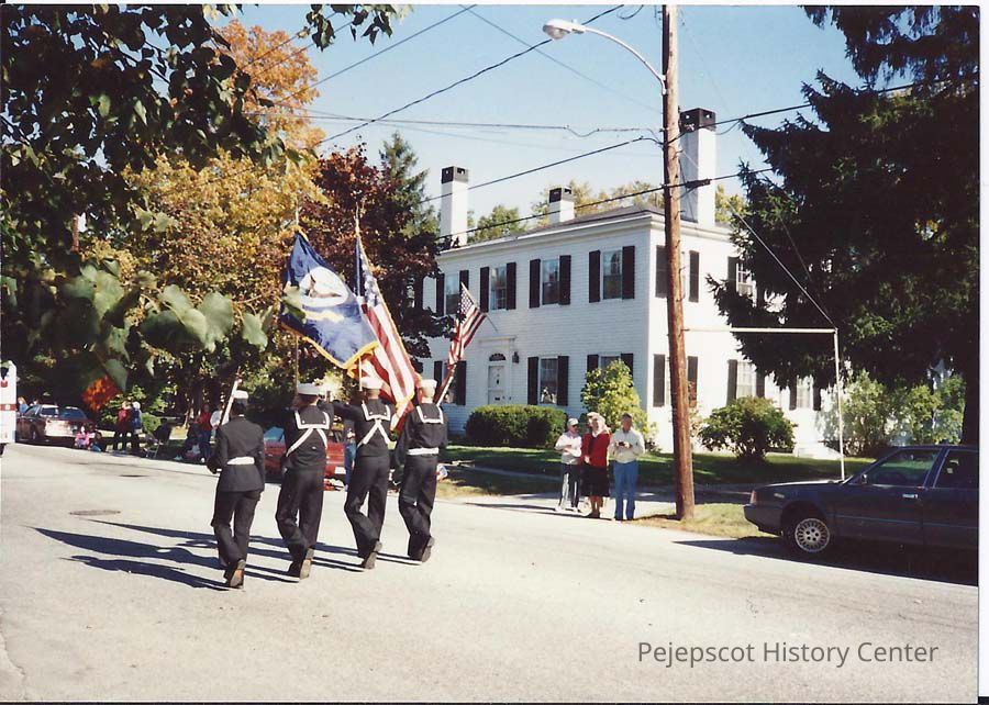 A color photograph of the US Navy Color Guard in Brunswick's 250th Anniversary parade. The photo was taken in front of Bill Shipman's house on Federal Street. 10/07/1989