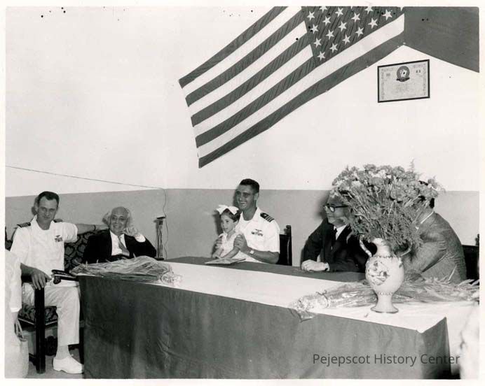 Five men sit around a table. Three men are civilians and two U.S. Navy officers. One officer is holding a little girl on his lap. There are flowers on the table and a U.S. flag behind it. The back is stamped "OFFICIAL U.S. NAVY PHOTOGRAPH - NOT FOR PUBLICATION UNLESS OFFICIALLY RELEASED." Undated