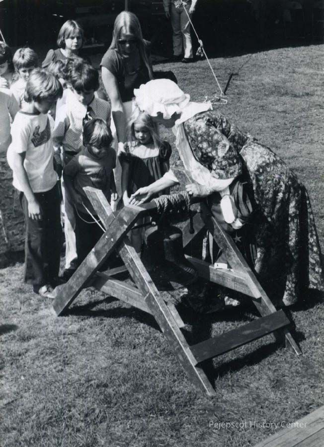 B/W photo of a woman in period costume showing a bell to some children at the Bicentennial Celebration on the Brunswick, ME, Mall. 7/4/1976.