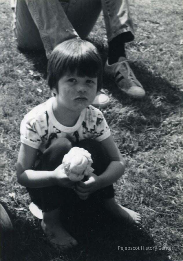 B/W photo of a small girl on the Mall, Brunswick, ME, watching the Bicentennial Celebration. Dated 7/4/1976.