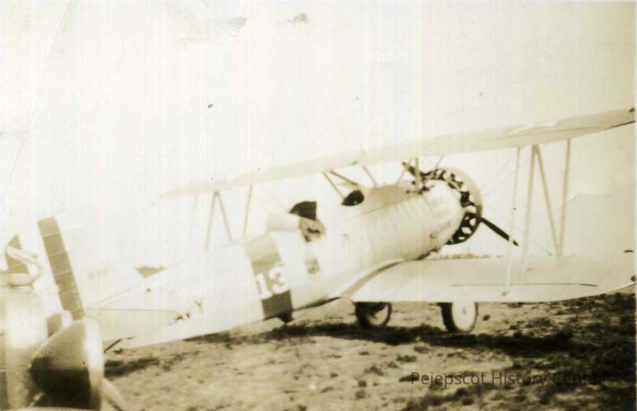 A B/W photograph of the first airplane to land on Navy land in Brunswick. 1937