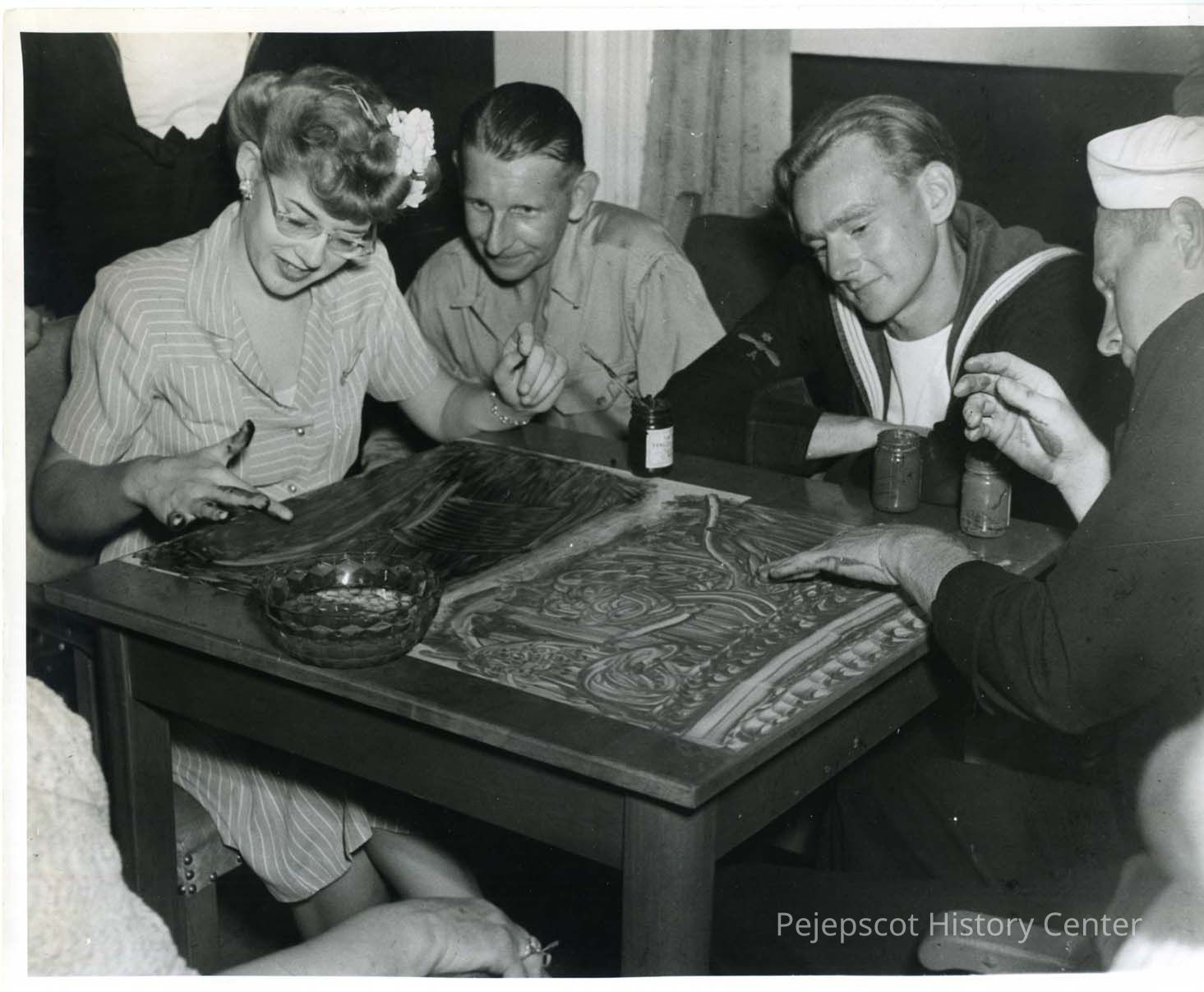 At the USO three sailors fingerpainting. Undated