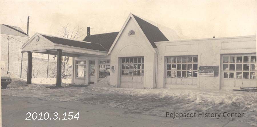 A B/W photograph of a vacant gas station on Maine Street. No clipping. Undated