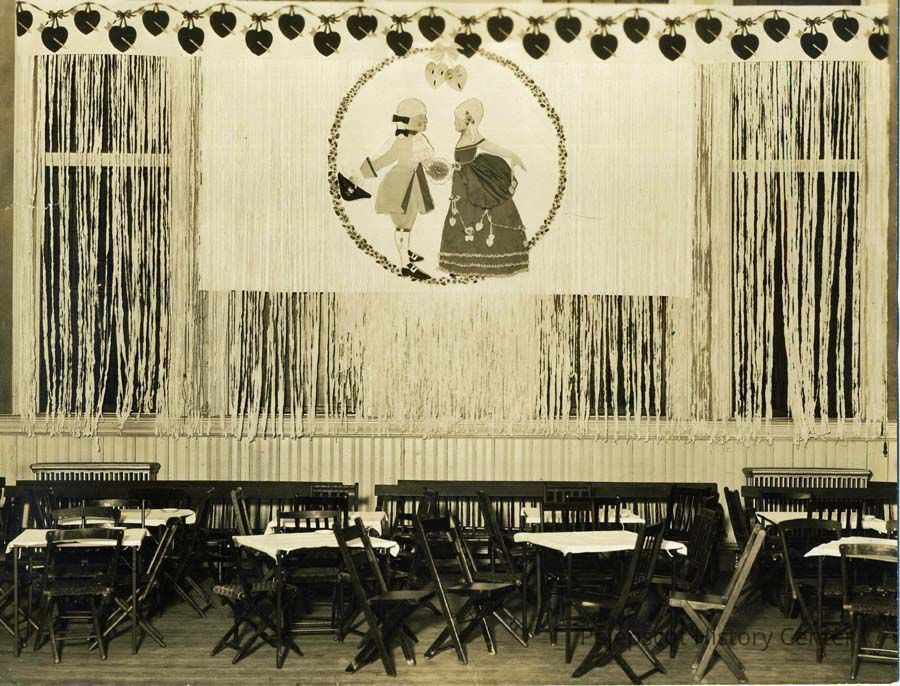 B/W photo from the Maine Sunday Telegram of the decorations on the north side of Town Hall for the Valentine Pop Concert of the Madisses Club of Brunswick. The Madisses Club was a women's club of the First Parish Church. No date.