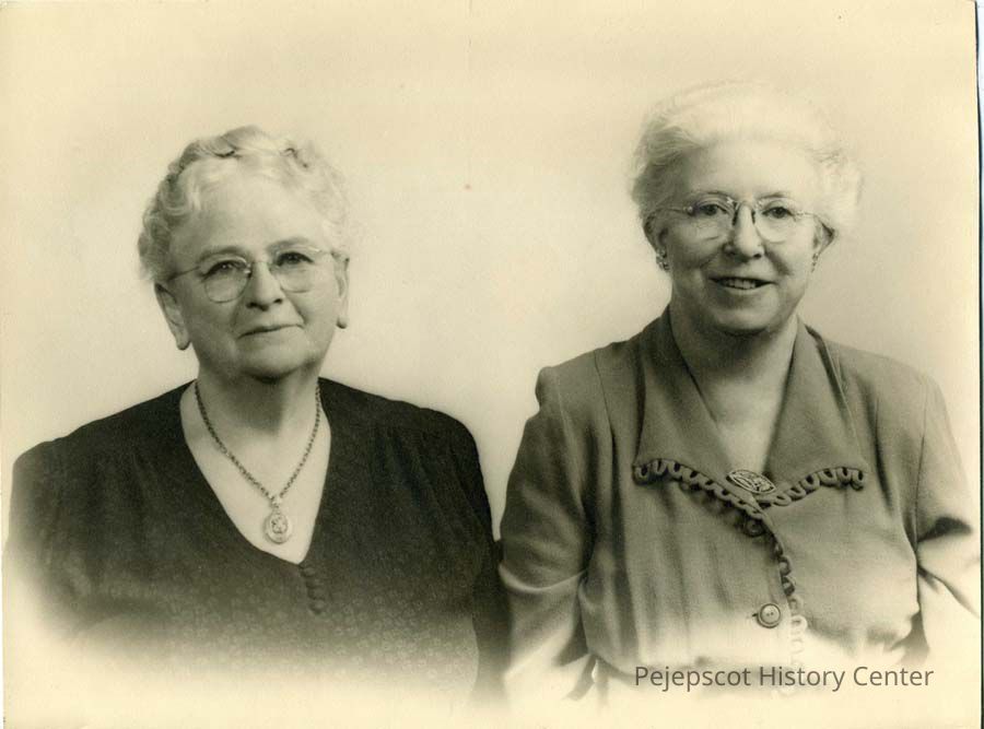 An undated B/W photo of (left) Miss Helen Varney (art teacher) and (right) Miss Amy Stetson (teacher and musician), both from Brunswick, Maine.