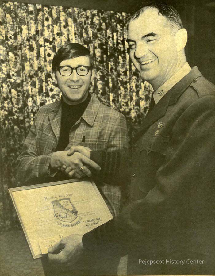 An undated black and white photo of Verdi L. Tripp, of Topsham, and an unidentified Navy officer. The certificate the men are holding, which appears to be dated 8/23/1968, is from the Blue Angels, the Navy's demonstration flight team.Collection