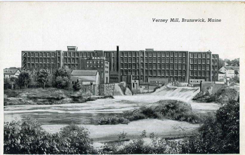 Andros Mill, Androscoggin Dam, Androscoggin Mill, Androscoggin River, Androscoggin River Falls, Architecture - Brunswick, Brunswick - History, Buildings - Brunswick, Factories -Brunswick, Historic buildings - Brunswick, History - Brunswick, Industry - Brunswick, Industry - Maine, Industry - New England, Postcard, Streets - Mill Street, Streets - Maine Street, Verney Brunswick Mills, Inc., Verney Corporation, Verney Mill, Verney Mill Falls, Verney Mill Building