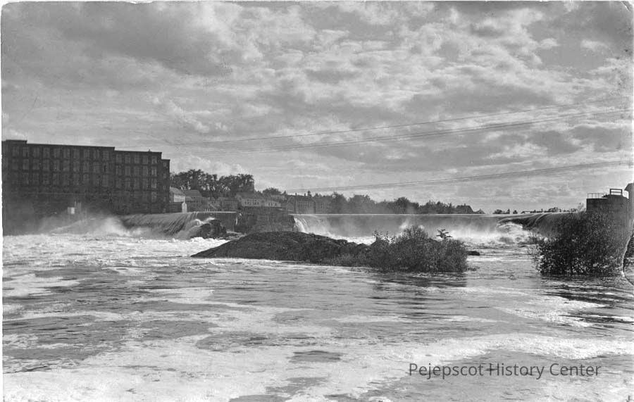 A B/W picture postcard of the Verney Mill in Brunswick and the Androscoggin River Falls taken from Topsham, ME. Undated.