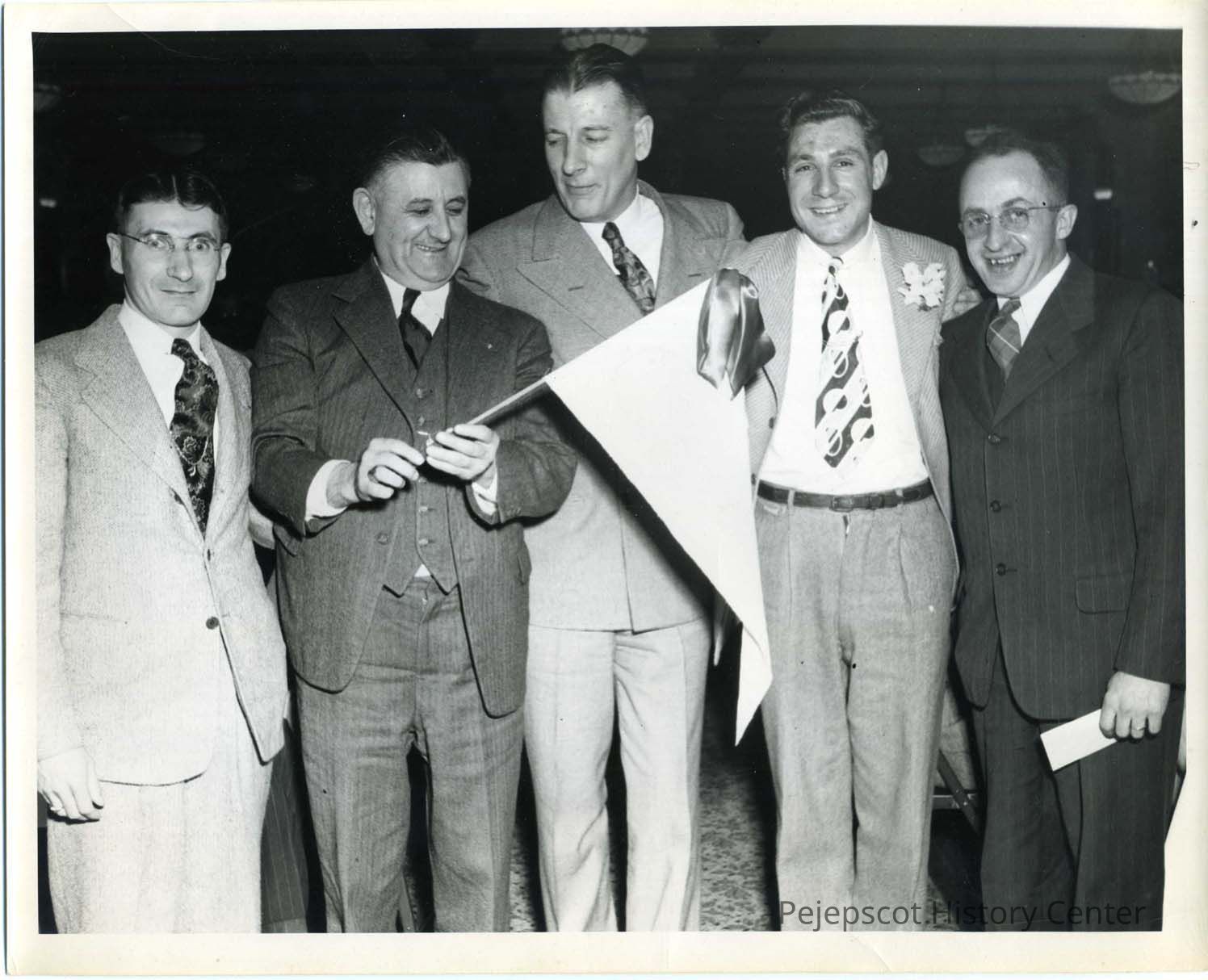 Five employees holding the Verney Mill baseball pennant. Undated
