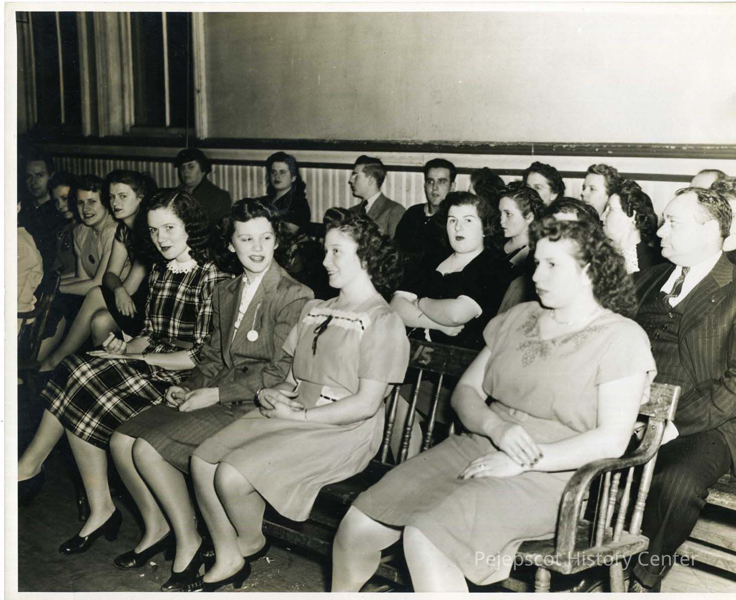 A group of Verney Mill workers sit in the town hall at the Verney Mill Christmas party. Philip Ouelette sits on the far right. Undated