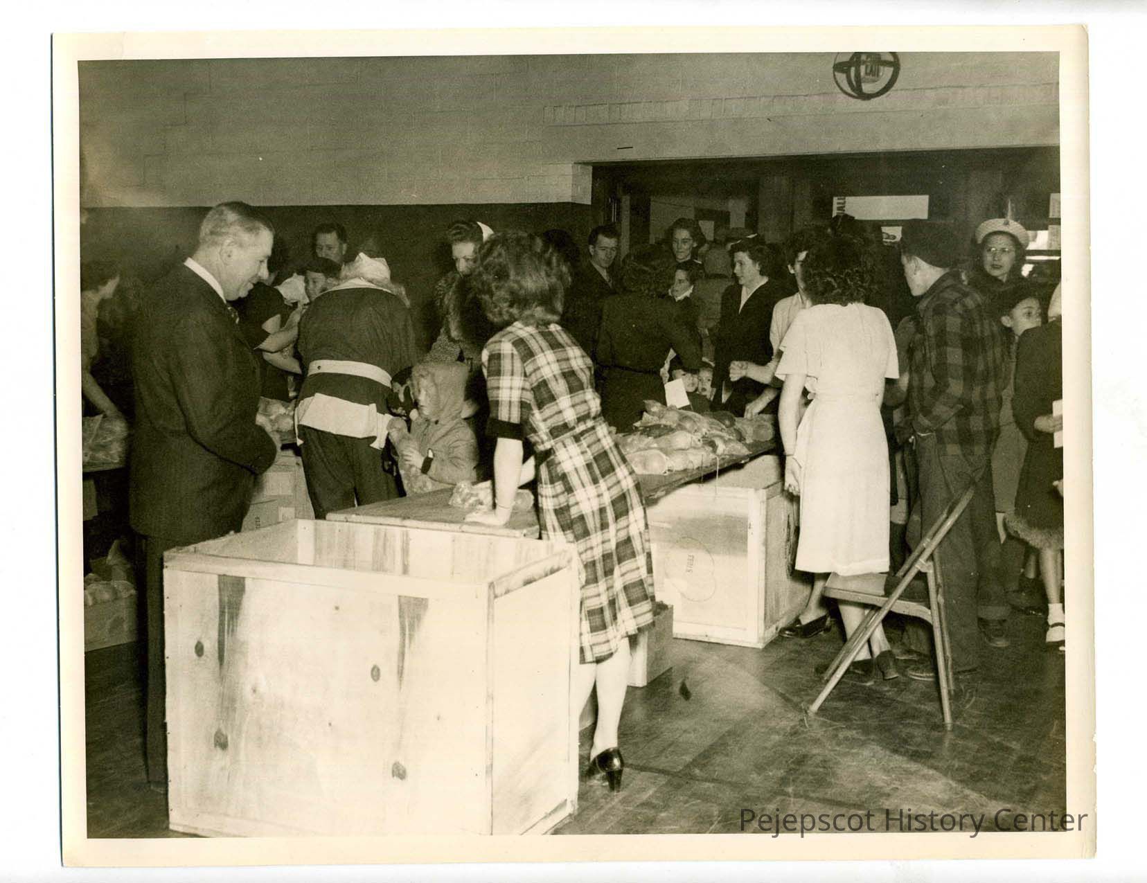 A Verney Mill Christmas party in either the old Town Hall or the mill. Bags of fruit are piled on boards set on big boxes with women standing behind the makeshift counters. They appear to be handing out bags to the children and adults crowded in the room. A Santa appears the the center of the photo. Undated