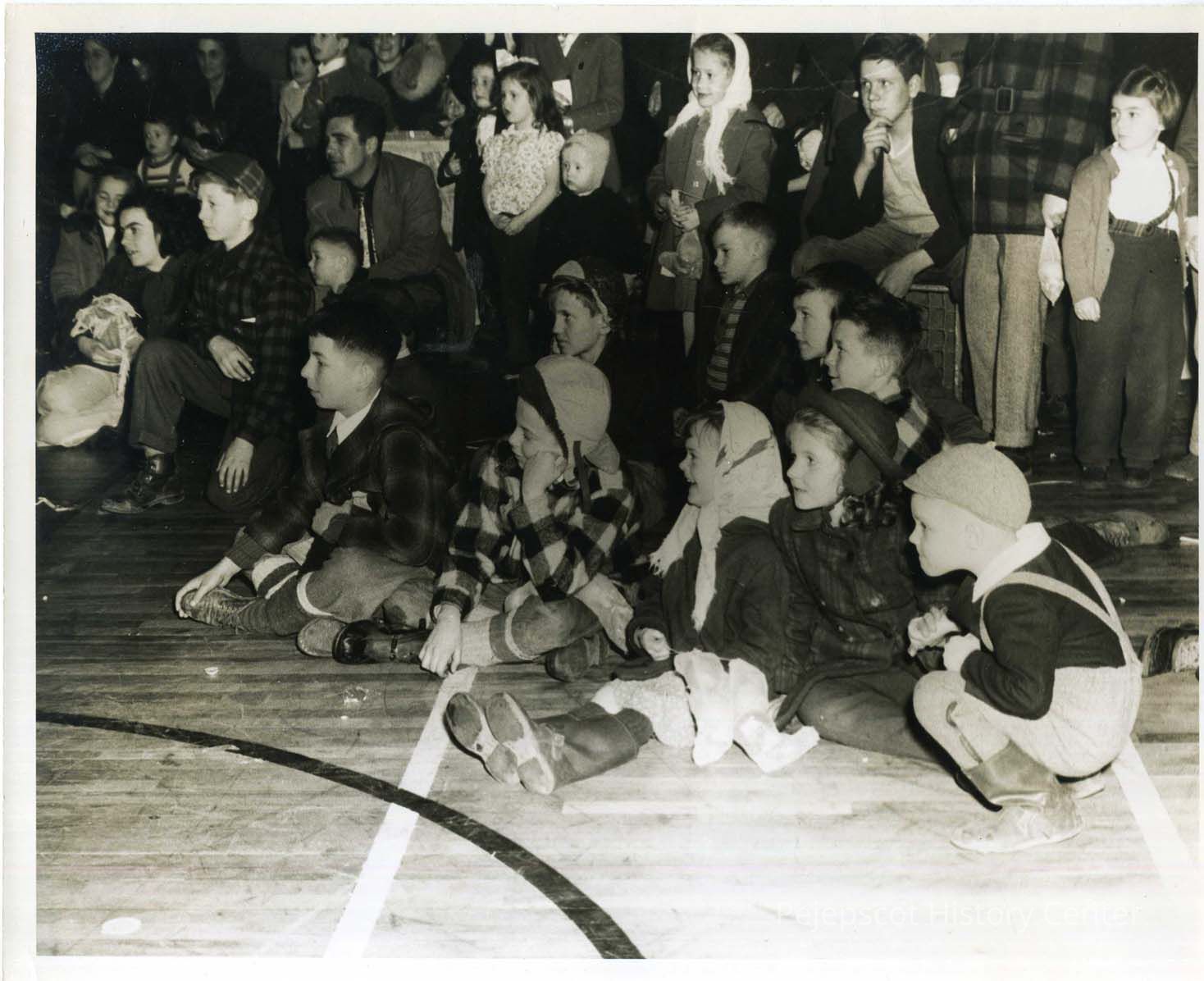 Children seated on a gym floor in the old Town Hall at the Verney Mill Christmas party. Undated