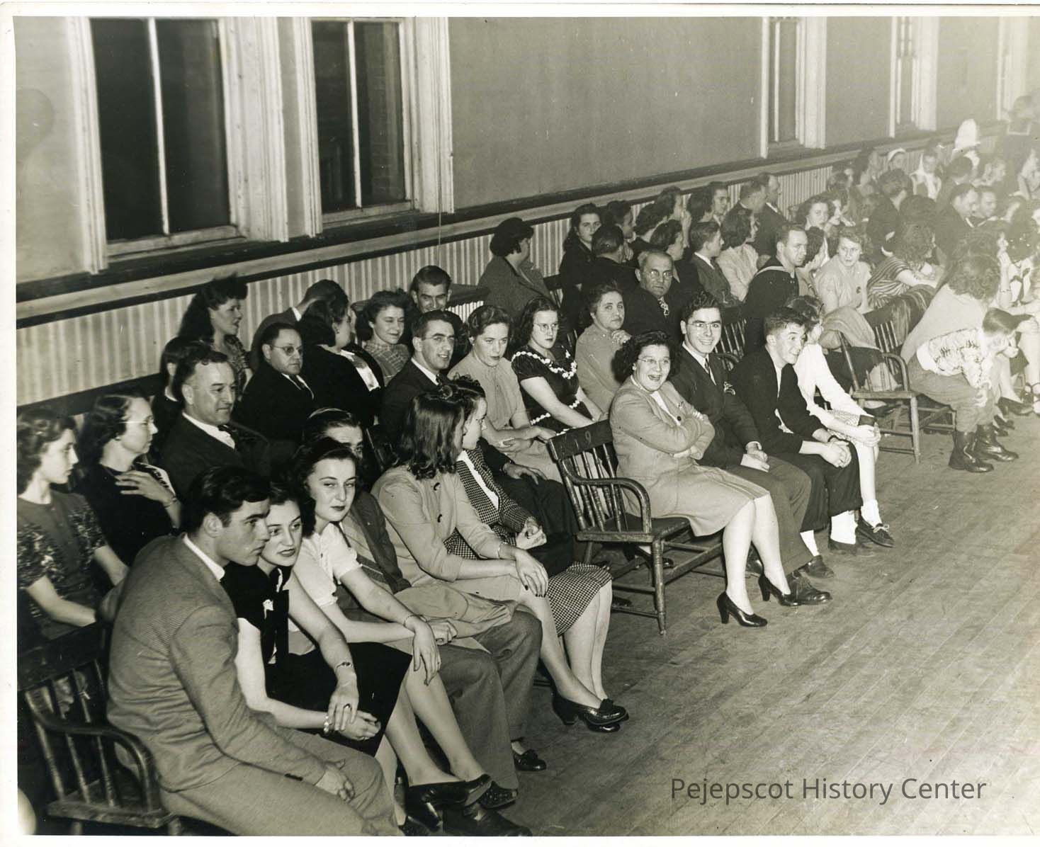 A group of Verney Mill employees sitting in the old Town Hall at the Verney Mill Christmas party in the late 1940s. Undated