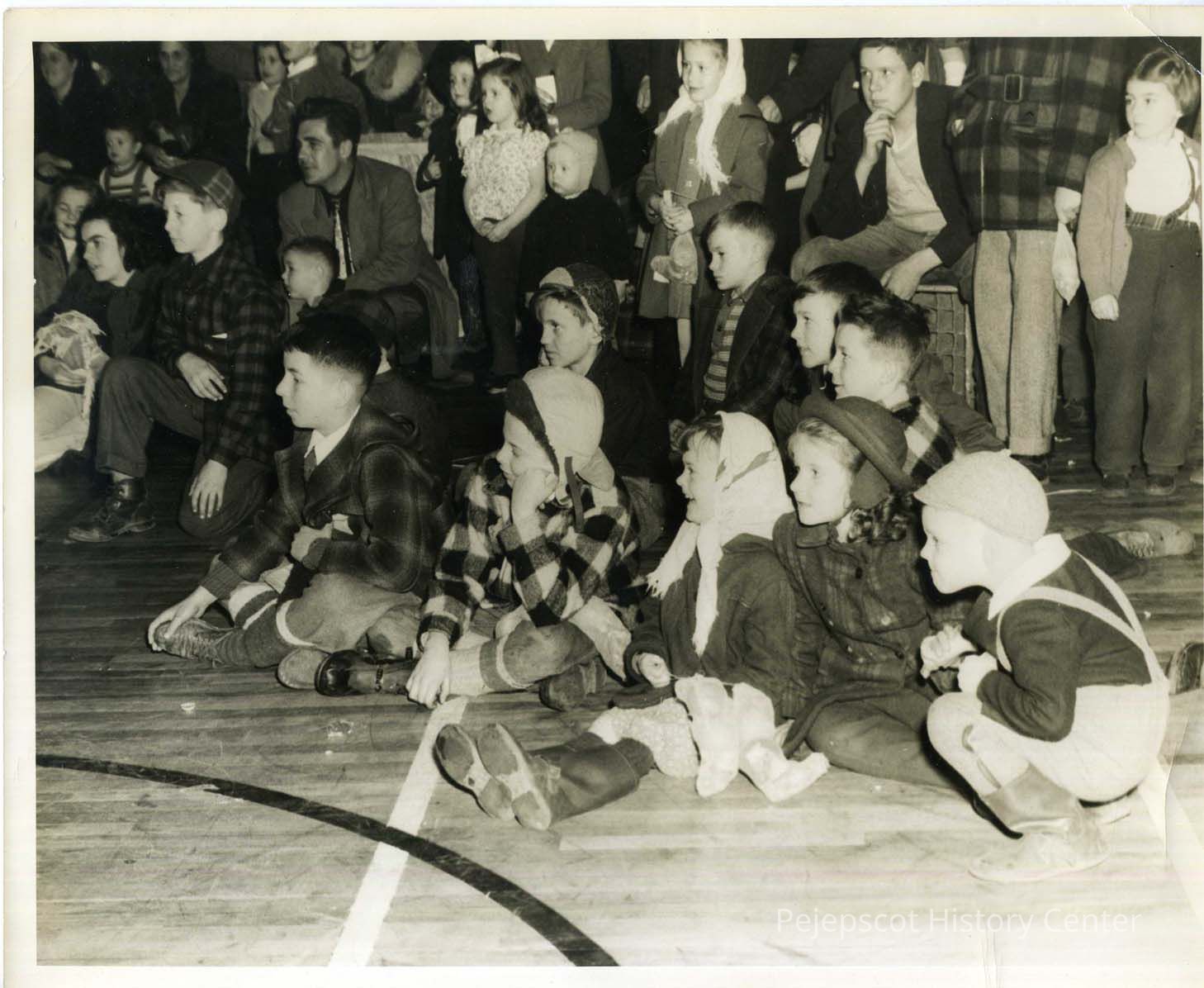 Children attending the Verney Mill Christmas party sit on a gym floor in the old Town Hall. Undated