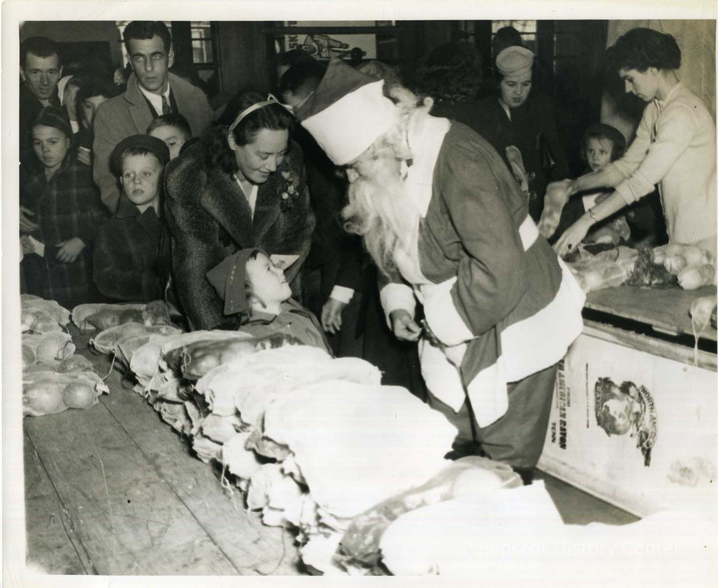 Verney Mill employees and children receive gifts of fruit at the Verney Mill Christmas party. On the extreme left stands Mr. Livernois and on the extreme right is Annette Brassard.