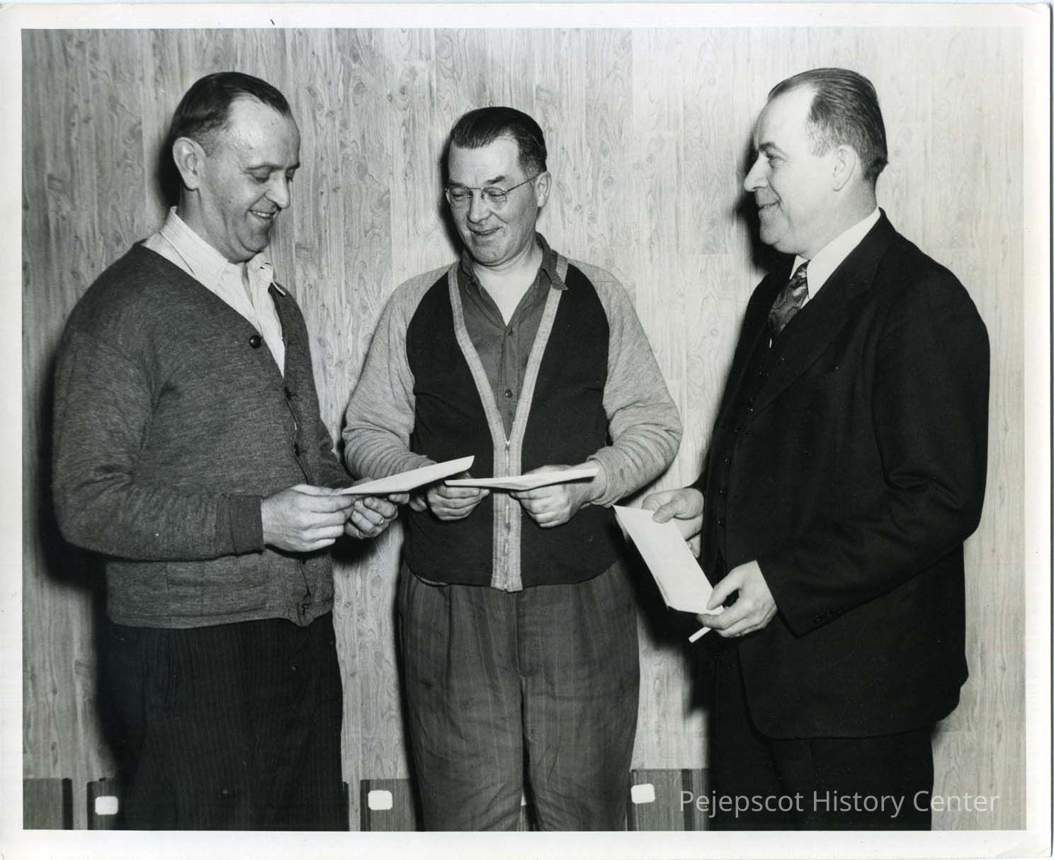 Three Verney Mill employees holding envelopes one of whom may be Felix Lafeffier(?). Undated