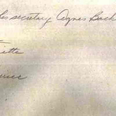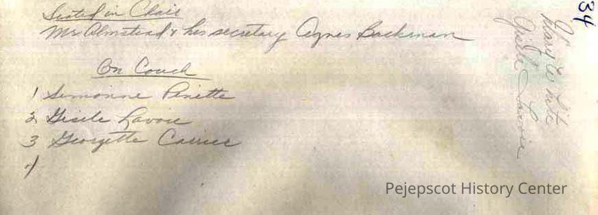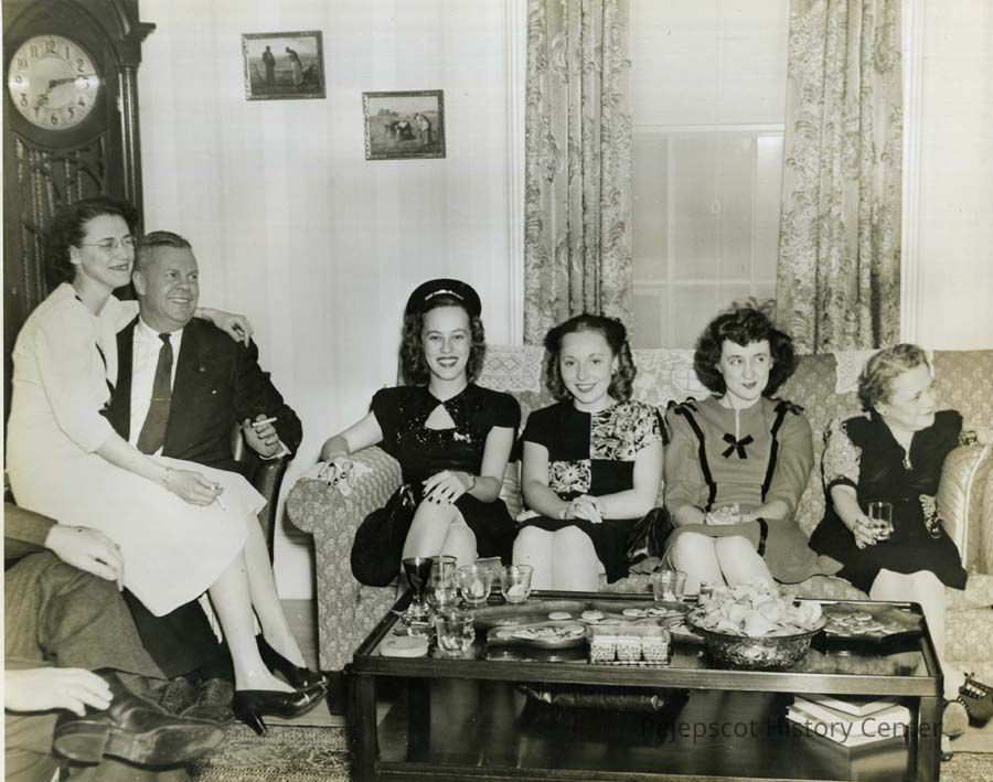A B/W photograph of a Verney Mill office party. Seated at left, Mr. Olmstead and his secretary Agnes Backman. Seated on the couch, Simonne Pinette, Gisele Lavoie, Georgette Carrier and the last is not identified. UndatedCollection