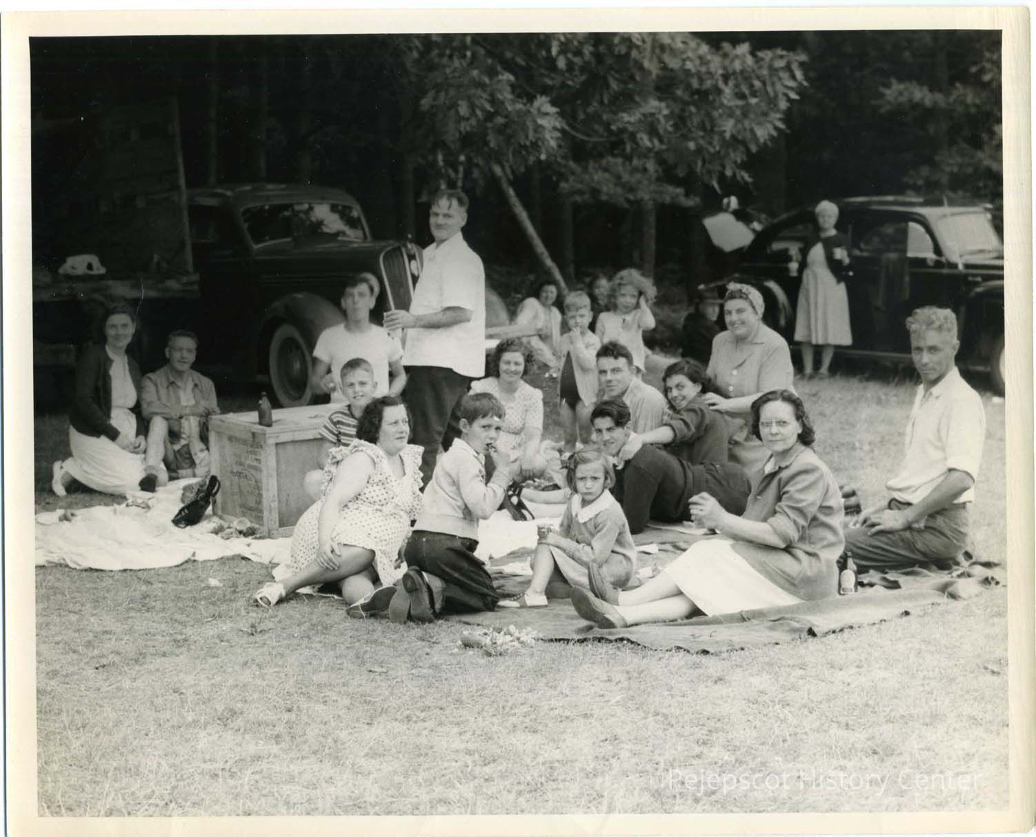 A group of people enjoying themselves at the Verney Mill picnic. The man standing in the rear is Irenee Fluet. The first lady on the ground is Helena Cote. The lady in the dotted dress in the second row is Florence Painchaud with Germain Painchaud. The lady in the bandanna on the right is Florence Fluet. The lady on the blanket to the far right is Annie St. Pierre and the man on the far right is Dominique Cote. Undated