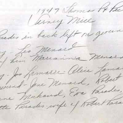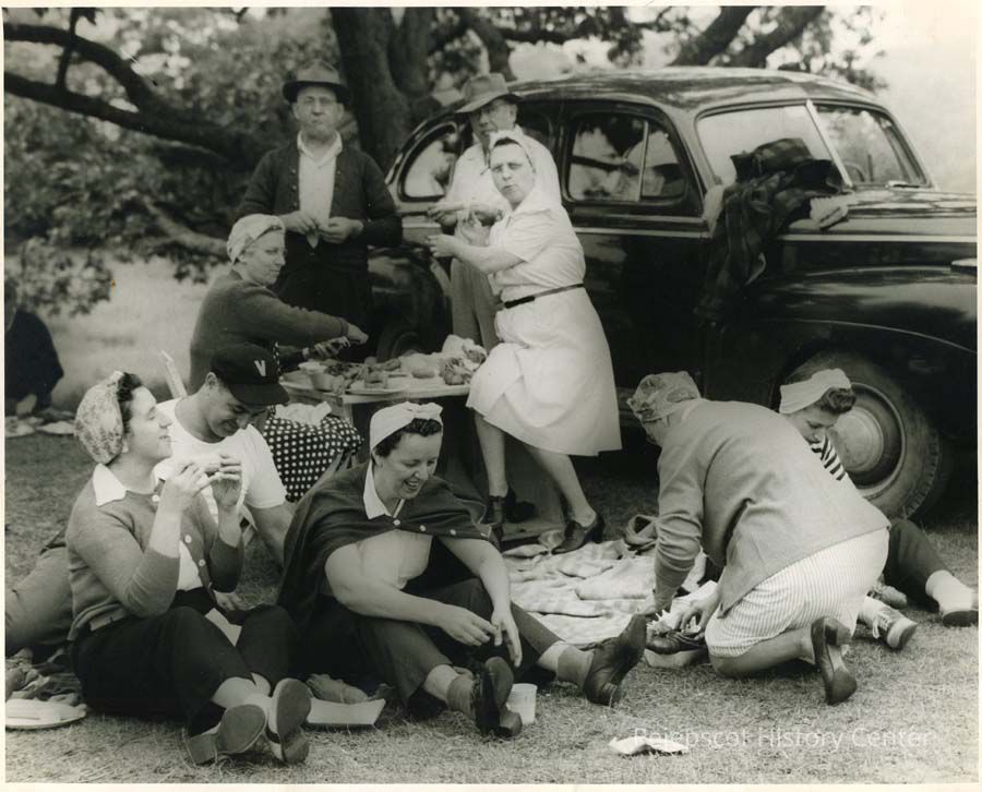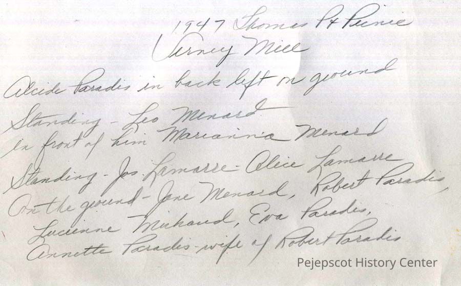 A B/W photograph of the 1947 Verney Mill picnic at Thomas Point Beach. The people are: Alcide Paradis, in back left on the ground; standing, Leo Menard; in front of him is Marianna Menard; standing Joseph Lamarre; Alice Lamarre. On the ground, Jane Menard; Robert Paradis; Lucienne Michaud; Eva Paradis; Annette Paradis, wife of Robert Paradis; Stella Caron acting out.Collection