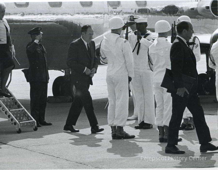 Black and white photograph of Vice President Hubert Humphrey arriving at Brunswick Naval Air Station. The photograph was taken on 7/29/1967.