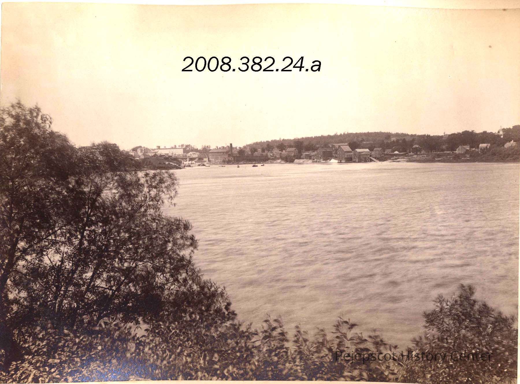 A B/W photograph of the Androscoggin River titled "From Down River." The Bowdoin Mill and Cabot Mill can be seen in the distance. Undated