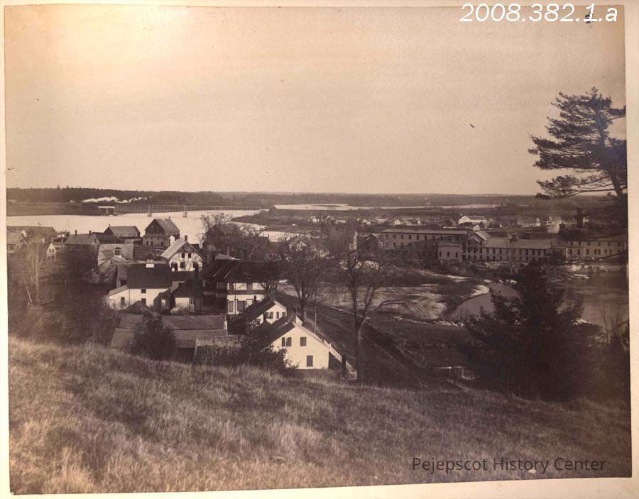 A B/W photograph titled, "View down the river from Topsham." The view is from a hill upriver of Topsham looking down the Androscoggin River. Pejepscot Paper Co. can be seen on the left side of the picture and the Brunswick Topsham railroad bridge can be seen in the distance. Undated