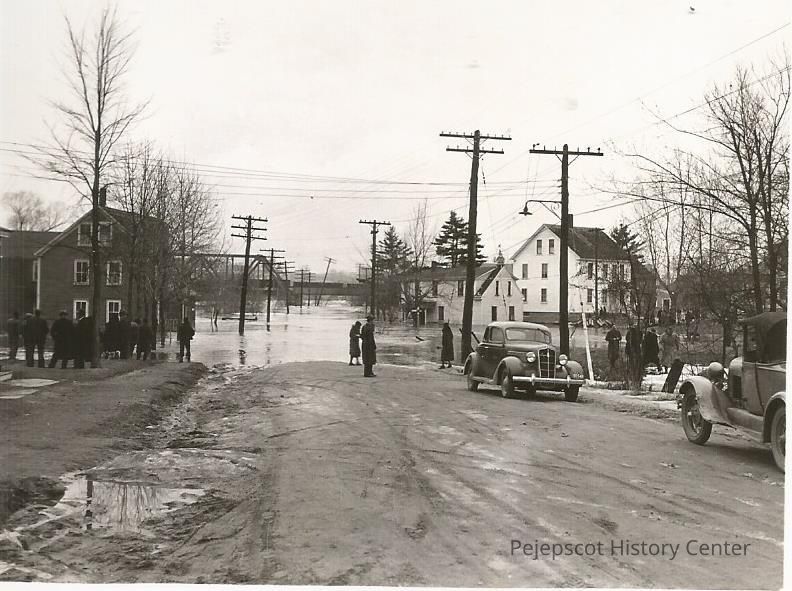 A B/W photograph of Mill Street in Brunswick, ME, looking back towards the Black Bridge during the flood. People and cars stand idle in the foreground. Undated, speculated from the 1936 flood.Lexicon