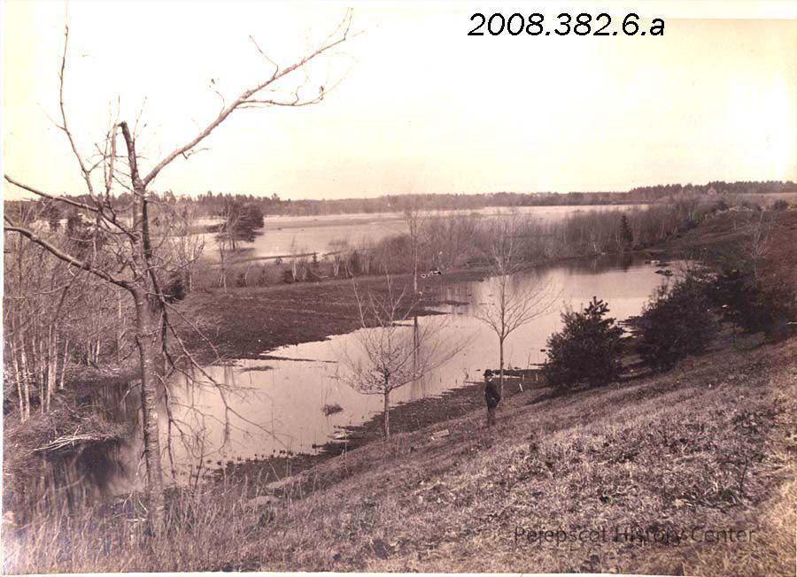 A B/W photograph of "River from Metcalf Cottage." It is a view of the Androscoggin River. Undated