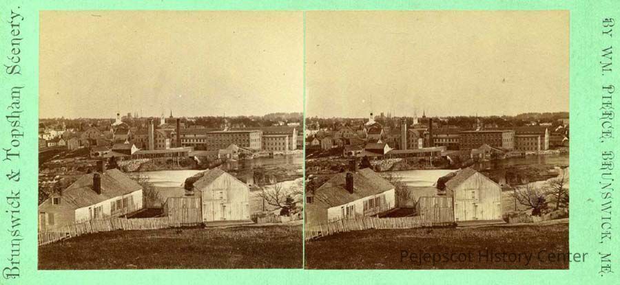 A sepia-toned stereo view of Brunswick, ME from Topsham. On the reverse of the photo, written in black ink is the name "Frank." Many church steeples are visible in Brunswick, as are the mills. Undated