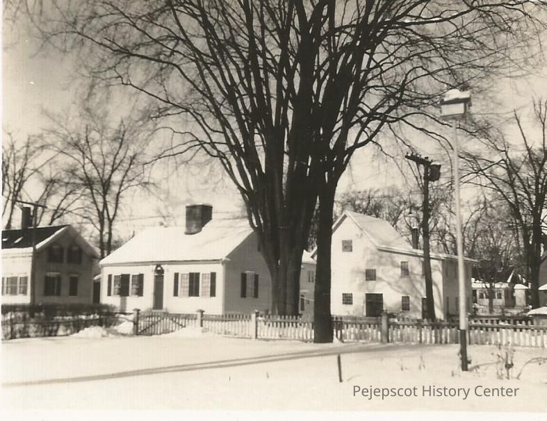 A B/W photograph of the Dennison House and end of Bryant House on Everett Street, Brunswick, ME. Undated.Lexicon