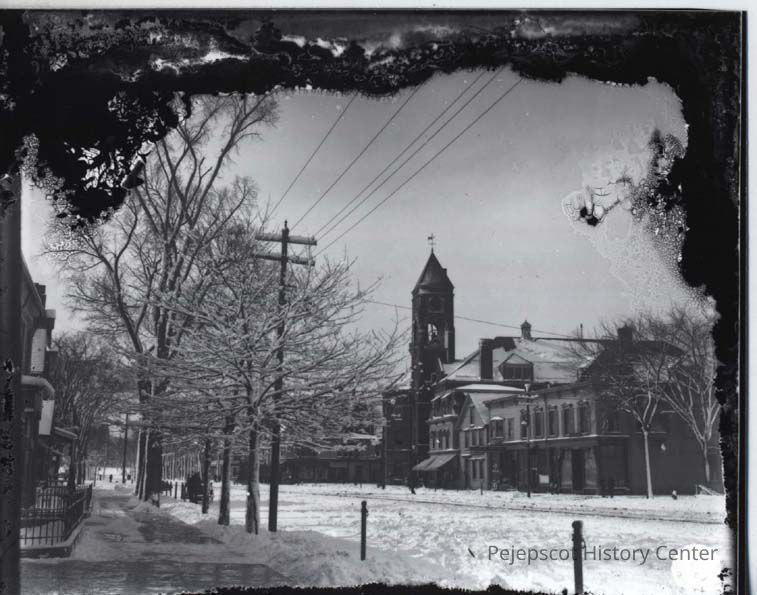 Photo of looking southwest from the intersection of Cumberland Street and Maine Street toward Town Hall.